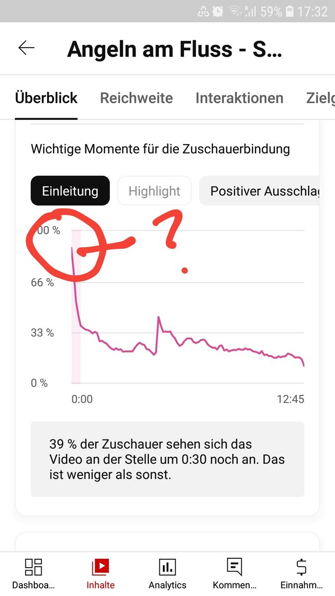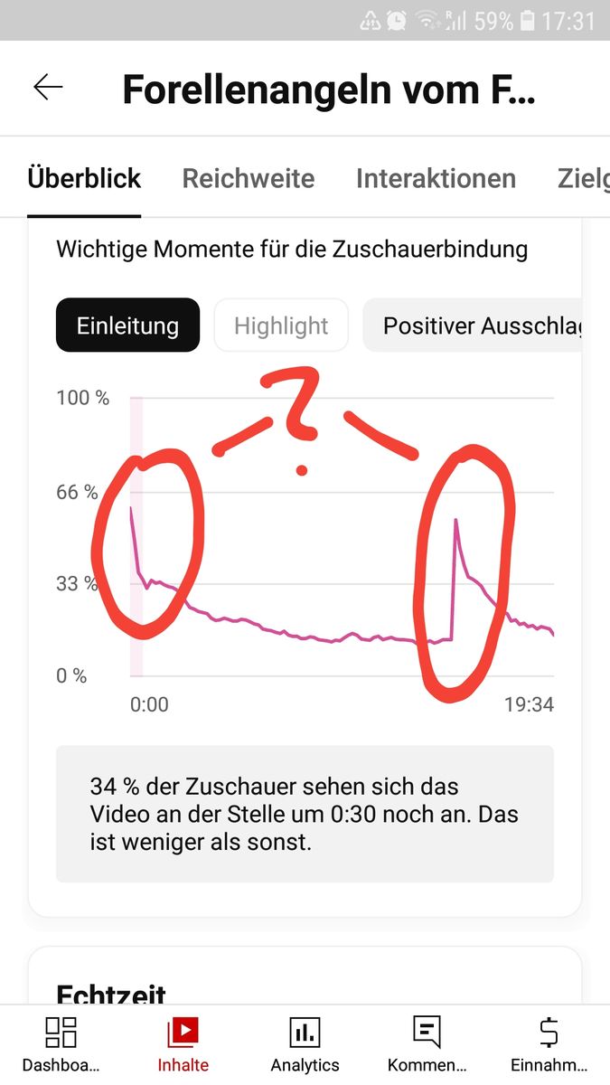 Was auffällt ist, dass die Zuschauerbindung nicht bei 100 % anfängt und manchmal an Stellen wieder zulegt, obwohl an der Stelle im Video nichts spannendes oder der Gleichen passiert (siehe Bild links). Echt komisch wie ich finde.