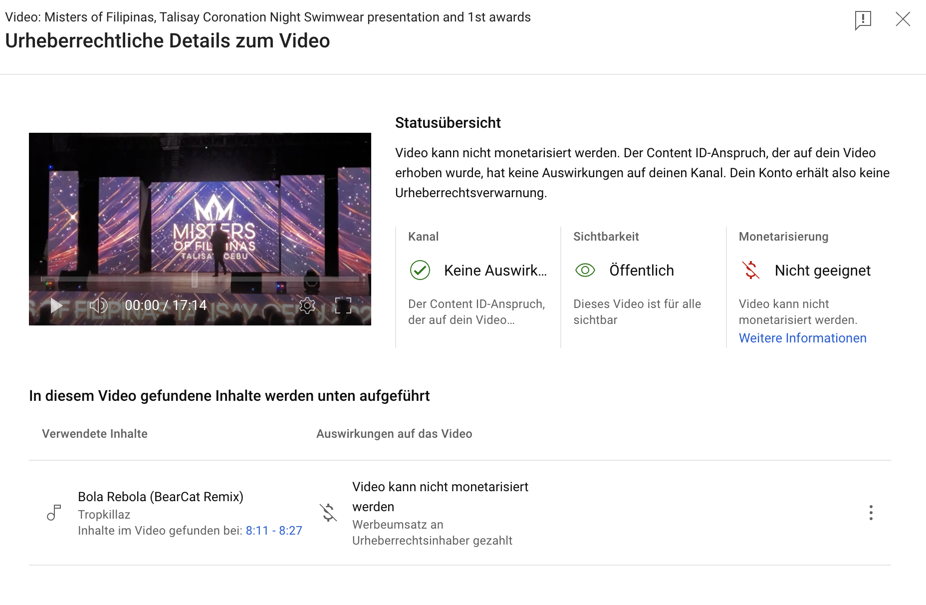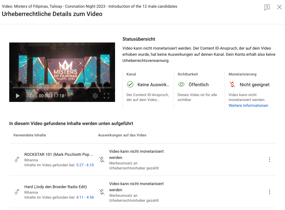 Jetzt findet YouTube exakt 90 Sekunden (c) Musik - also nichtmal 12% des Videos, sperrt aber direkt 100% des Videos für Werbeeinnahmen.