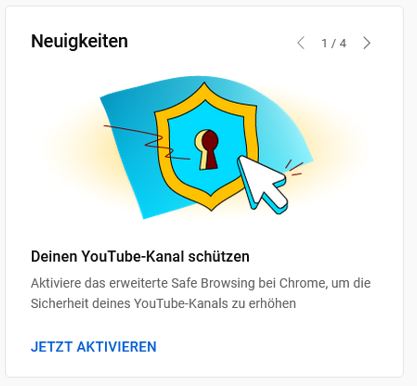 wisst ihr was es mit dieser Meldung (siehe Foto) im Youtube Dashboard auf sich hat? "Aktiviere das erweiterte safe Browsing bei Chrome um die Sicherheit deines Youtube Kanals zu erhöhen"