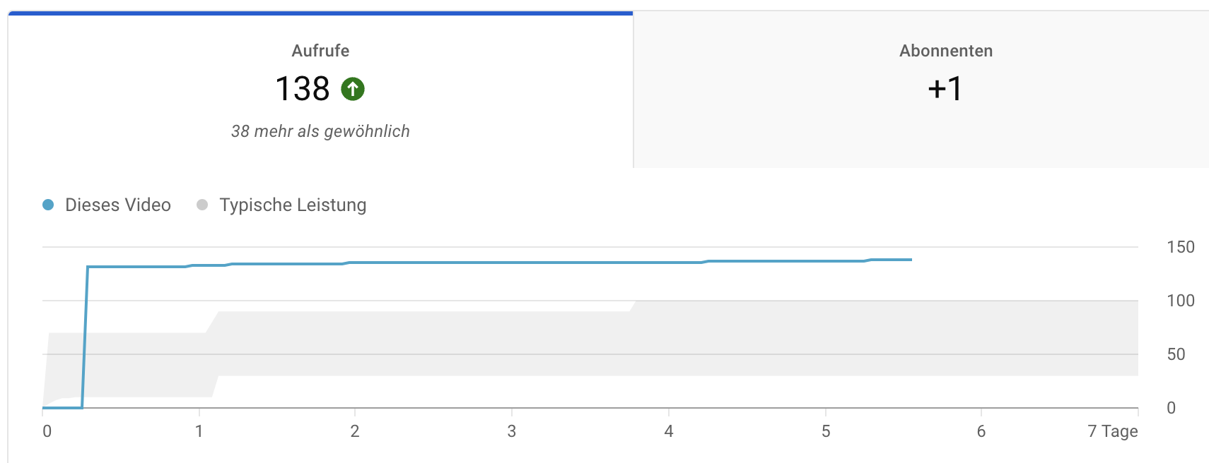 Das erste Video wurde 614 mal angezeigt und das zweite nur 148 mal. Somit ist natürlich die Aufrufzahl davon stark abhängig. Damit ist interessanterweise die Klickrate beim zweiten mit 34% wesentlich höher als beim ersten mit 22%. Die höhere Anzahl der Aufrufe für das erste Video ist also ausschließlich auf die höhere Anzahl von Impressionen zurückzuführen, oder anders gedacht, hätte das 2. Video die gleiche Anzahl von Impressionen erhalten, wäre eine höhere absolute Anzahl von Aufrufen zu Stande gekommen.