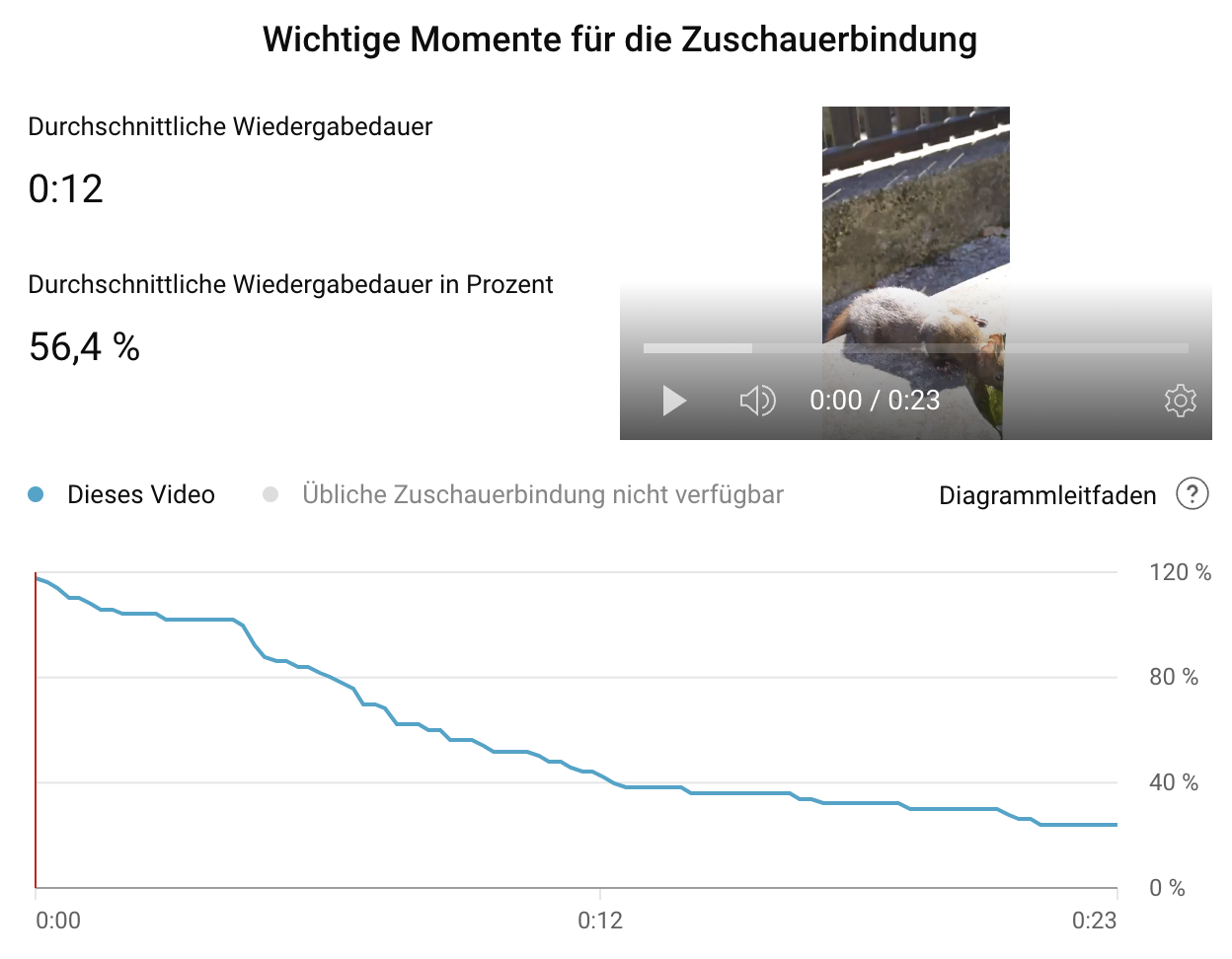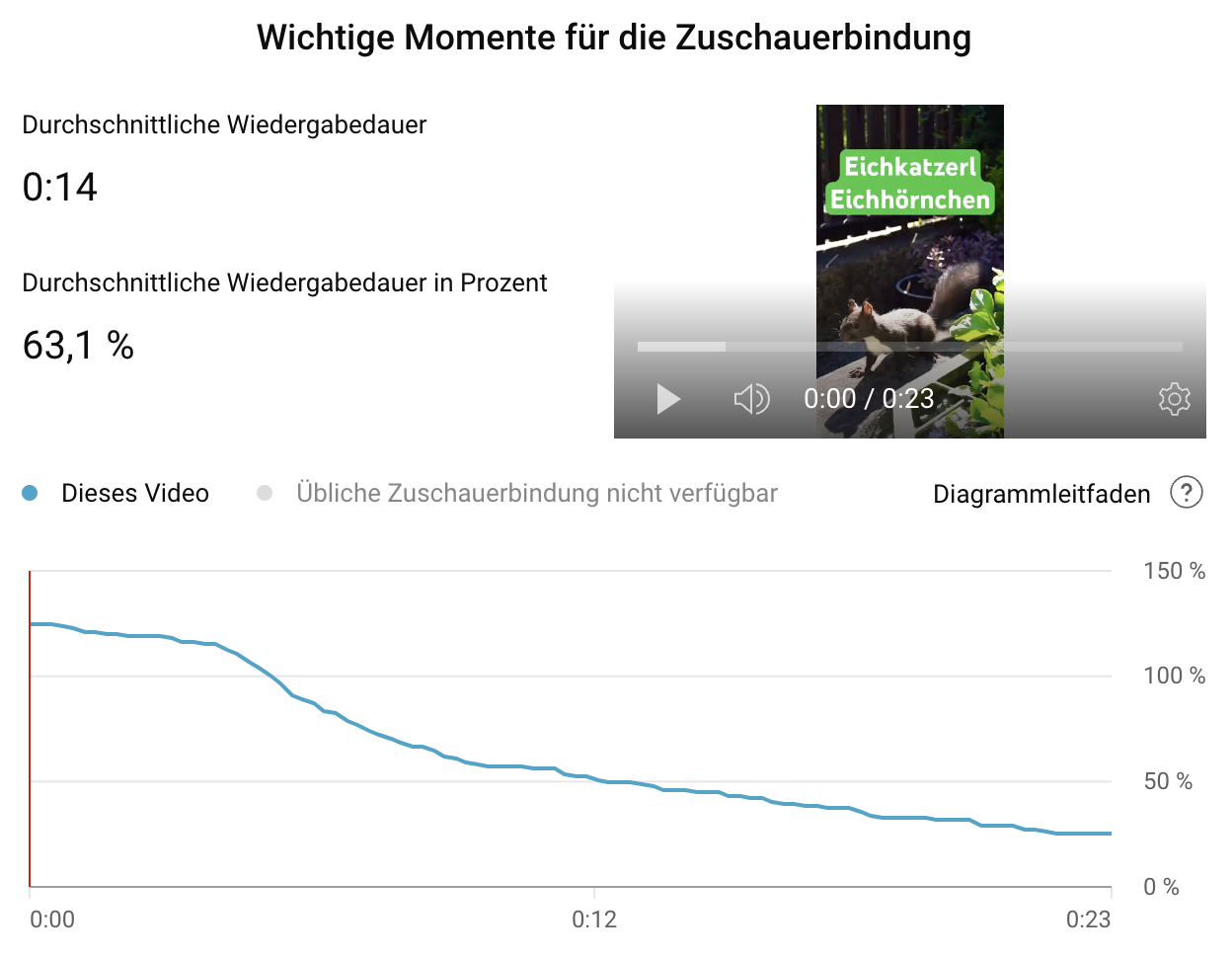 Bei meinem Vergleichstest habe ich ein Short mit 23 Sekunden von einem Eichhörnchen beim Wassertrinken hochgeladen und aufgrund des lauten Windes und der Umgebungsgeräusche den Ton durch Musik unterlegt. Das Shortsvideo wurde bis jetzt 138 mal angeklickt und zeigt folgende Statistiken: