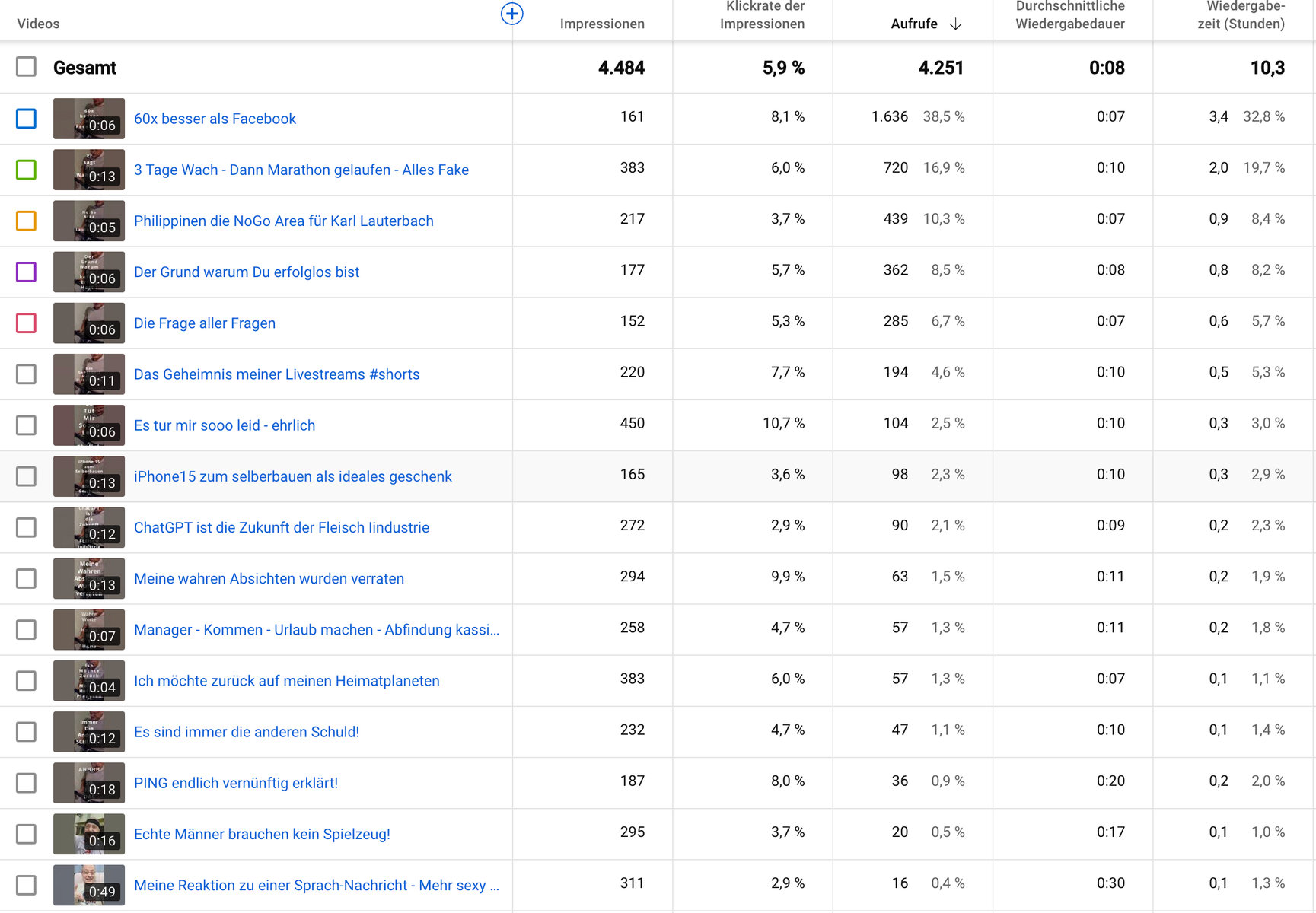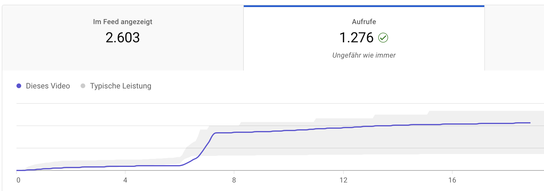 Wenn ich dabei aber an Stelle eines Contents für den Verein (z.B. aktuelles Tor des letzten Ligaspiels oder Interview eines Spielers oder des Trainers) einen anderen Fussballcontent poste (z.B. Short eines anderen Fussballspiels), dann muss ich froh sein über 100 Views zu erhalten. Man sieht also, es liegt nicht alleine an der Kanalgröße sondern daran, was die Zuseher auf dem Kanal sehen wollen, denn oft werden die Originalcontent-Shorts auch nach der "Impressionsrakete" noch wie normale Videos angesehen und die Aufrufe steigen noch weiter an.