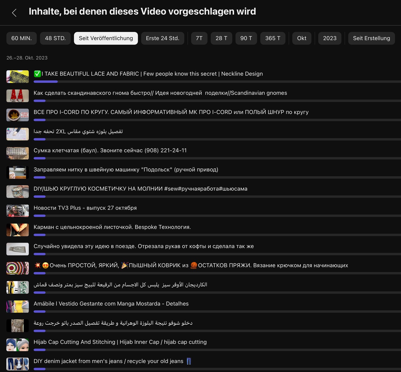Ich mache Videos zum Thema nähen und habe da die ersten paar Videos hochgeladen. Beim 3. Video hat YT mich schon recht fleißig in anderen Videos vorgeschlagen, beim 4. Video war es dann richtig viel. Das hat natürlich zu Aufrufen und auch einigen Abonnenten geführt. Jetzt dachte ich, ich nutze die Welle und habe das letzte Video eine Woche früher eingestellt. Dieses schlägt YT zwar auch vor, allerdings nur in nicht deutschsprachigen Inhalten. Englisch wäre jetzt nicht so das Thema, das schauen auch viele deutschsprachige Nutzer. Aber es schlägt mich neben ein paar englischen Inhalten bei russischen, arabischen und indischen Inhalten vor. Das führt natürlich dazu, dass das Video komplett floppt. Ein Inder wird mit meinem deutschsprachigen Video natürlich nichts anzufangen wissen.