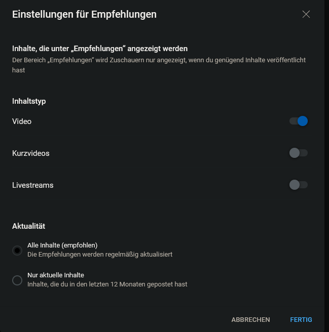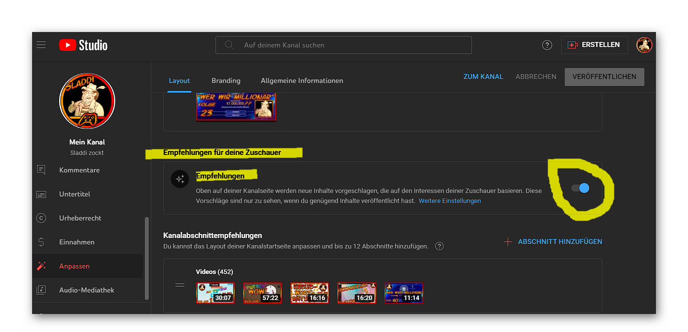 YT-Empfehlungen auf der Startseite