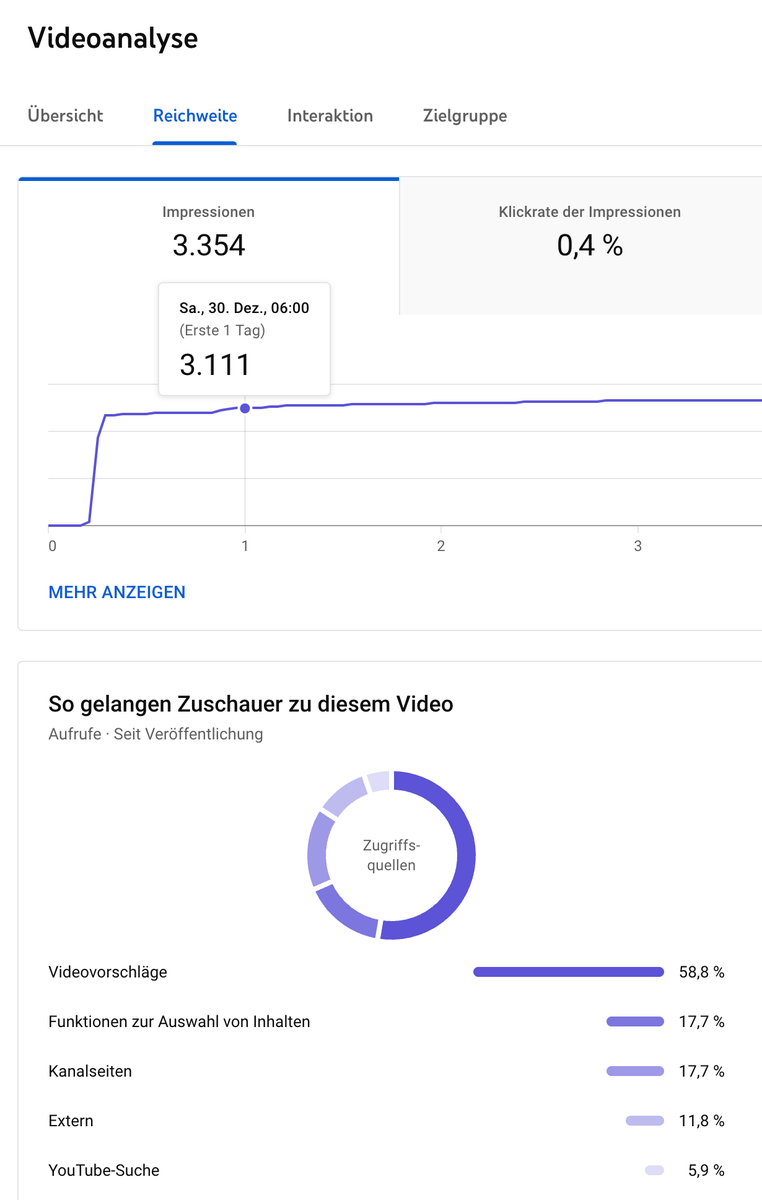 Es ist jetzt ein paar Tage her und ich habe das Thumbnail nach 1 Tag verändert. Die Impressionen sind bisher leider nicht nochmals angesprungen und daher hat sich die Aufrufzahl auch kaum erhöht, liegt derzeit bei 17 Aufrufen. Ich habe Dir mal einen Screenshot der Impressionen gemacht.