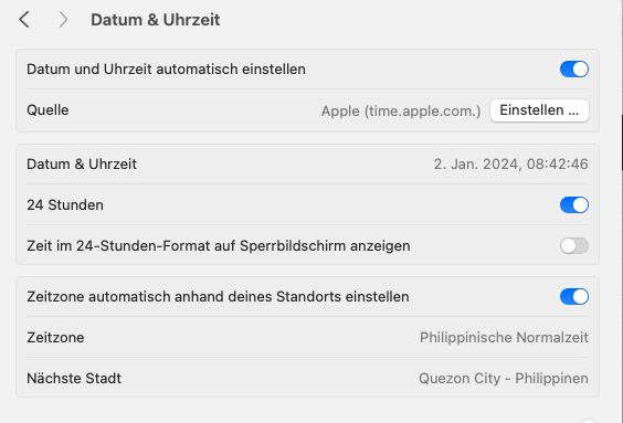 Mein iMac ist auf PH Zeit gestellt, das ist GMT +8 Std.