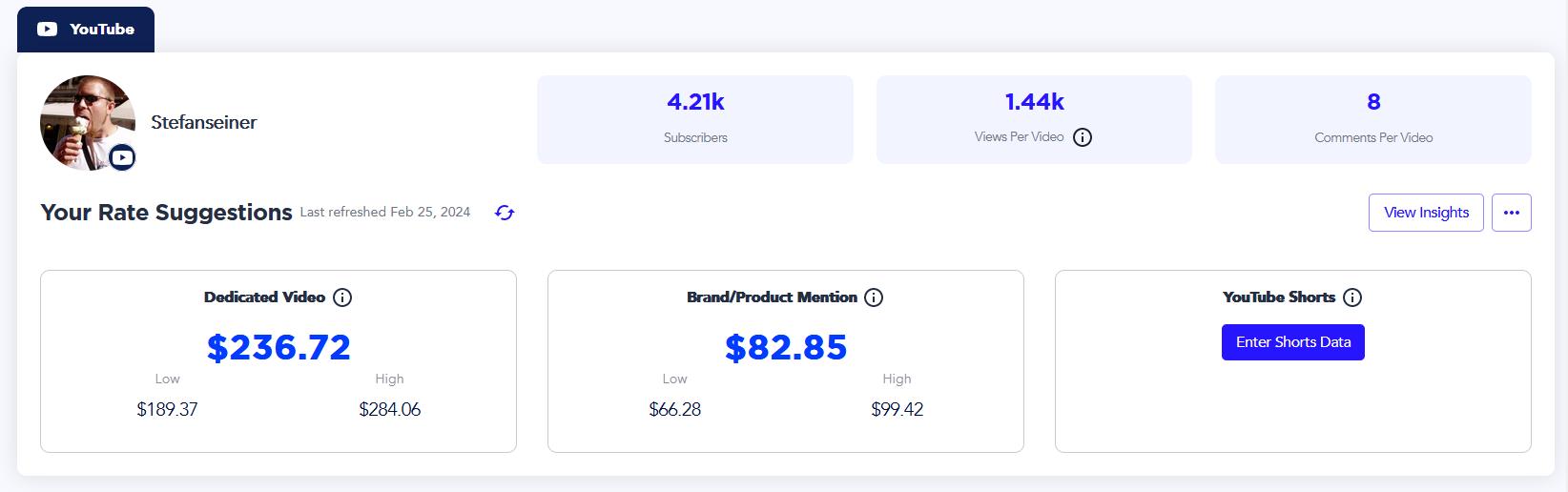 Primär soll der Wert des eigenen YT Kanals ermittelt werden, sieht bei mir aktuell so aus: