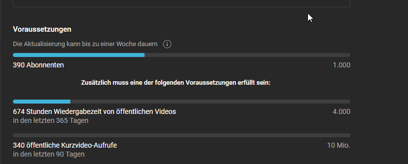 Gerade wenn es darum geht, die Leiste für die Monetarisierung vollzukriegen, musst du immer gut und gerne 1-2 Tage warten, bis der Balken nachzieht.