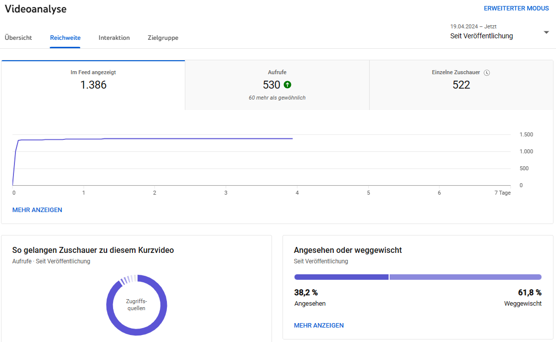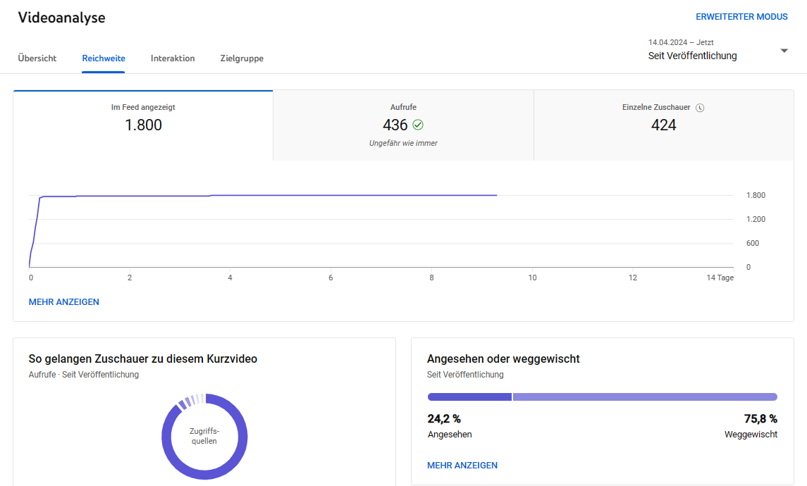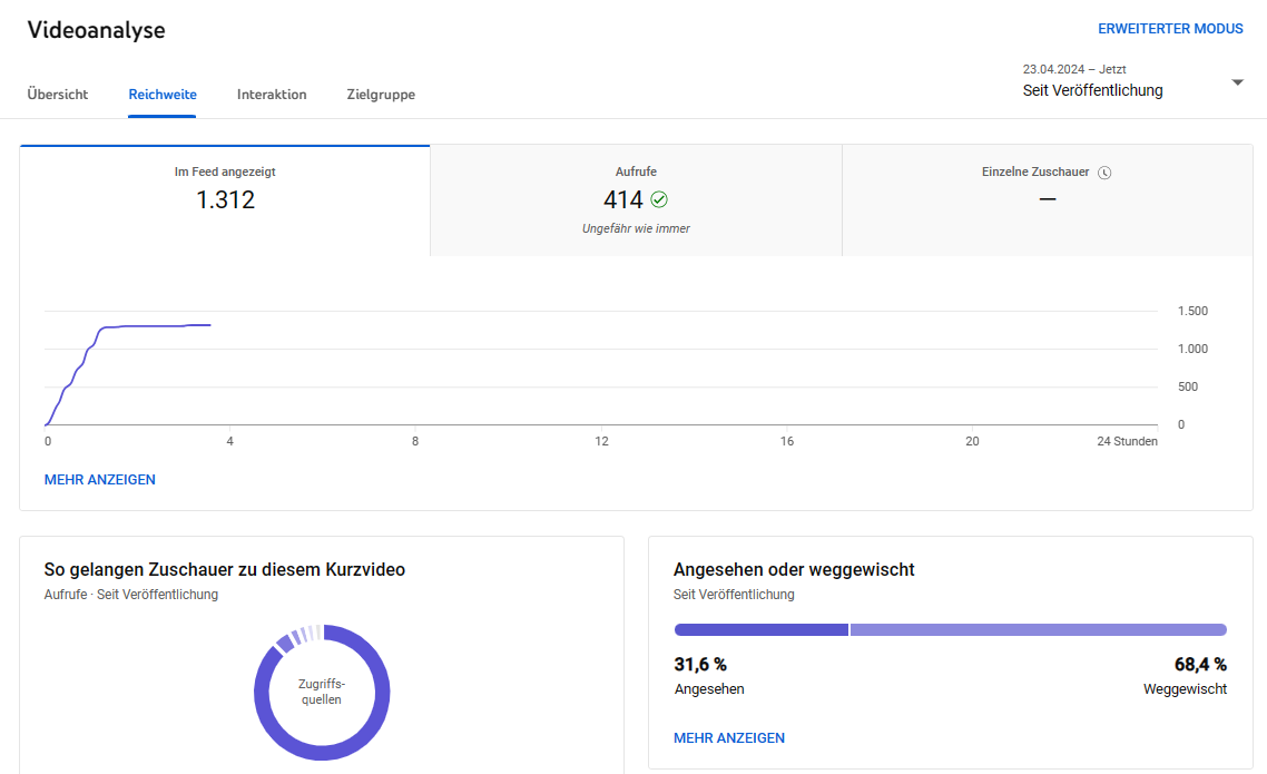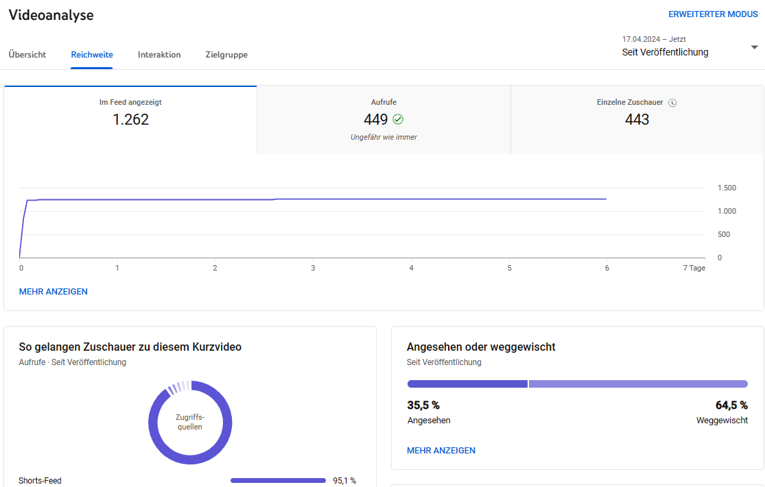 Die Shorts variieren dabei von den Aufrufzahlen von Anfang an zwischen wenigen 100 bis mehrere 1000. Dann hatte ich vor ca. 2 Monaten einen kleinen Durchbruch mit einem Short das über 100.000 Aufrufe erzielt hat. Die Freude war aber nur kurz, da seit diesem Short alle Aufrufe zwischen 400 und 500 von allen Shorts sind. Egal wie oft ich poste, egal zu welcher Zeit, egal was ich poste.