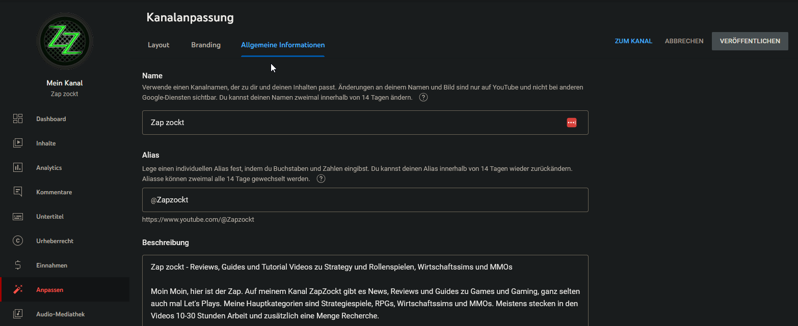 Ja, geht. Und zwar so, im YT Dashboard links auf Anpassen, dann oben auf Allgemeine Informationen klicken, dort kann man dann die Kanaldaten ändern. Das sieht so aus: