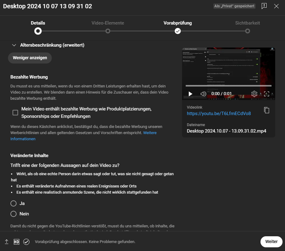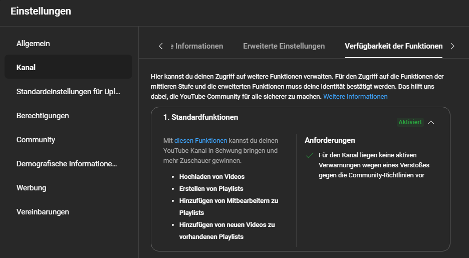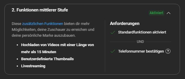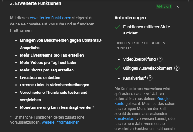 Mein Kanal ist freigeschaltet, ich darf längere Videos bringen, bin aber kein Youtube Partner und habe weit unter 1000 Abonnenten.