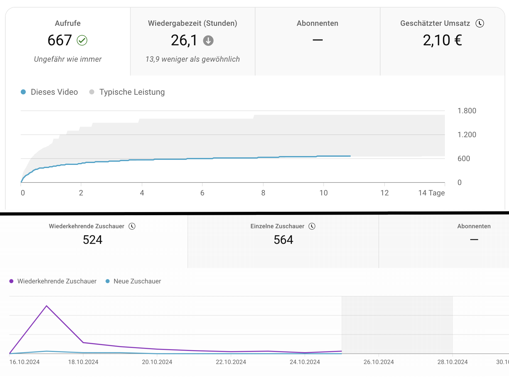 Und nun zu meinem subjektivem Empfinden. Nach wirklich knapp 3 Jahren in denen ich Videos am Fließband in jeder freien Minute produziert habe, fällt es mir mittlerweile wirklich immer schwerer, weil ich das Gefühl habe, es geht einfach nicht mehr voran. Bzw. nur linear. Meine Enthusiasmus schwindet einfach immer mehr und während ich Krisen vor langer Zeit damit abfedern konnte, dass einfach nochmal richtig Gas gegeben habe, fühle ich das aktuell nicht mehr. Ich dachte auch irgendwie immer "Hey, das wird". Einfach immer weiter machen. Und es macht ja Spaß. Und dieses Gefühl ist mir einfach echt abhanden gekommen. Mein lange Zeit bestes Video hat leider in den Suchrankings den ersten Platz eingebüßt und dann war mein Plan, dass ich mir starke Themen suche und damit wieder punkte und das aufhole. Aber selbst diese Videos ranken dann irgendwie auf Platz 3 und machen dann 15 Views am Tag. Ich sehe irgendwie nur, dass immer mehr Konkurrenz dazu kommt und ich nur langsam vom Fleck komme.