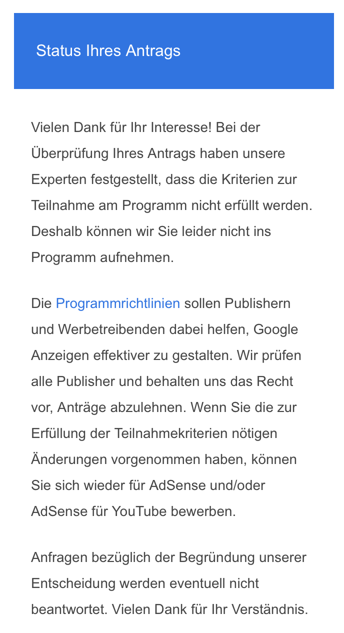 Leider wird mein AdSense Konto nicht freigegeben und ich weiß nicht, woran es liegen könnte.
