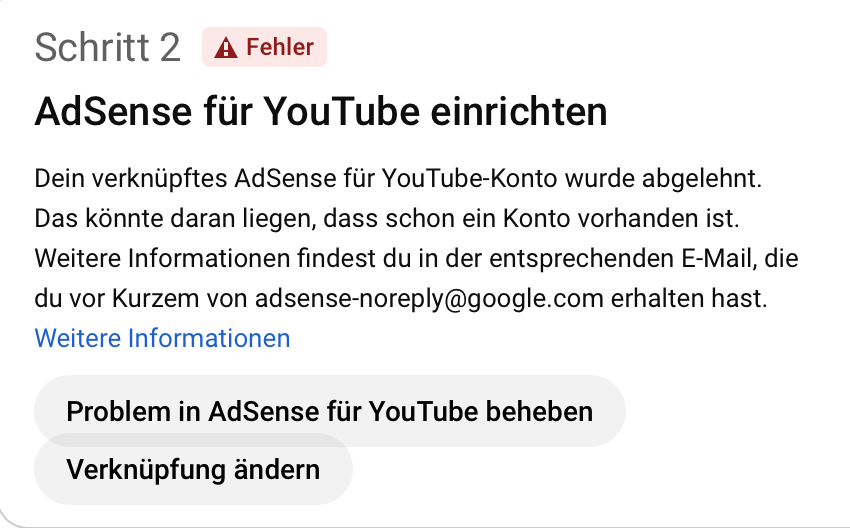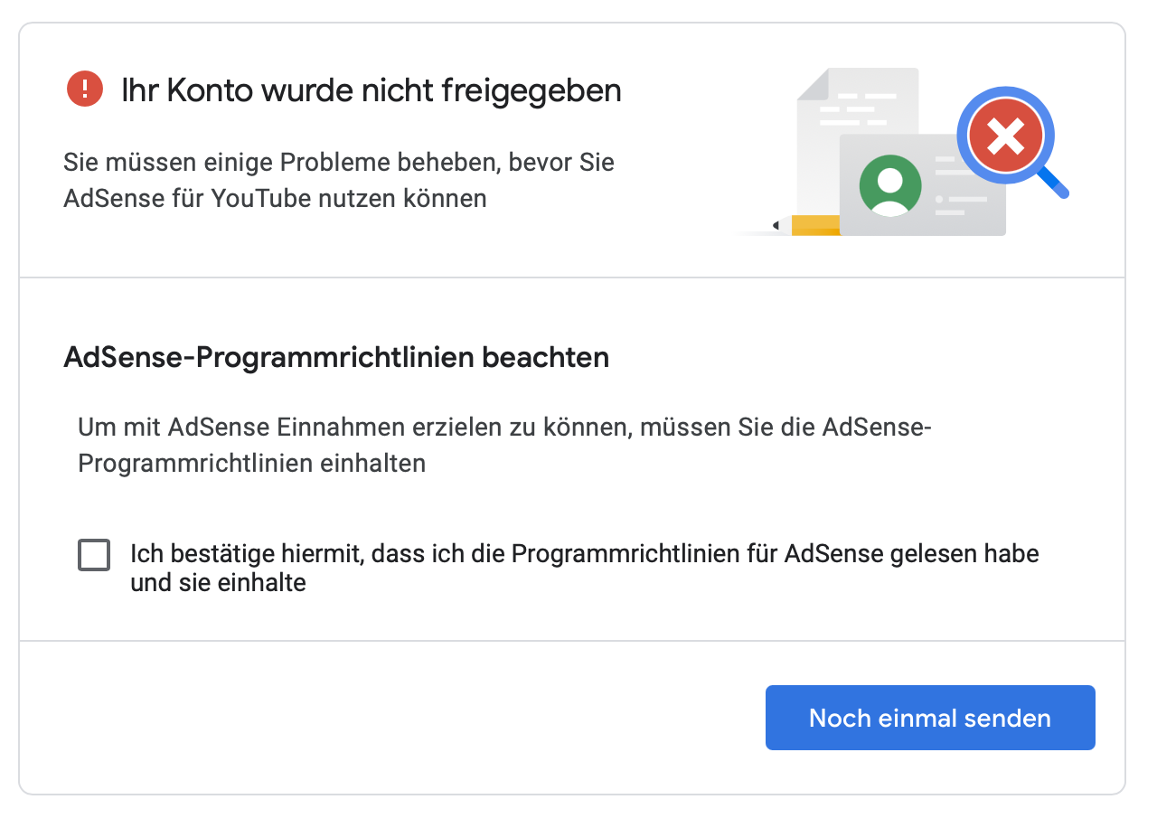 Ich erhalte immer wieder folgende Meldung in YT-Studio und werde dann auf AdSense verwiesen, wo ich die Freigabe noch einmal beantragen kann.