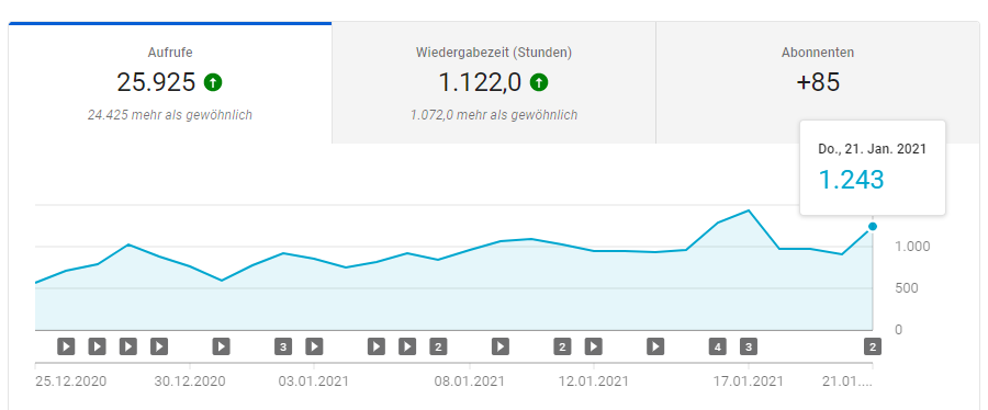 Bis zum November letzten Jahres merkte man kaum ein Wachstum auf dem Kanal, nun kommen auf meinem Kanal regelmäßig Videos auf dem Kanal und ich merke wie dieser stetig wächst. Ich kann es immer noch nicht glauben, von 49 (vor dem November) auf Stand heute (23. Januar) auf 171 Abonnenten.