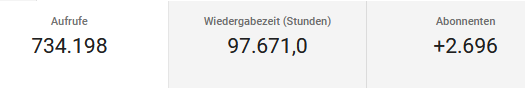 2020 - 3,5 Millionen Klicks - 445.000 Stunden - + 11.000 AbosWenn man das progressive Kanalwachstum berücksichtigt waren 2018 und 2019 die Dezember sehr schlecht. Schlechter auch als die zwei Monate zuvor und danach.