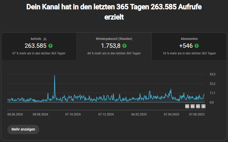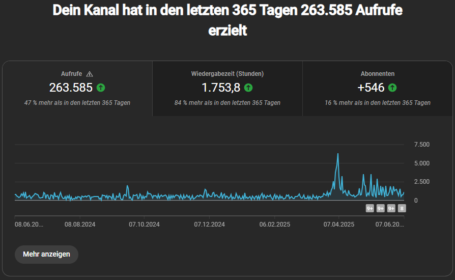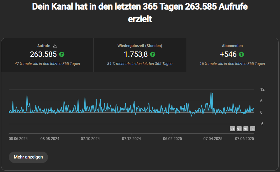 Ich denke mal man kann anhand des Grafen des letzten Jahres gut sehen wie sich alles so entwickelt hat und ich würde sagen Wiedergabezeit geht langsam stetig hoch, Rest stagniert allerdings inzwischen seit einem Jahr bisschen. Obwohl ich mich wie gesagt echt nicht beklagen kann, ich seh ja bei anderen Kolleg*innen in meiner Furry Bubble, dass es bei mir schon recht gut steigend ist. Vermutlich wäre man nie wirklich zufrieden, weil man sich auch schnell an neue Zahlen gewöhnt egal wie groß sie werden.