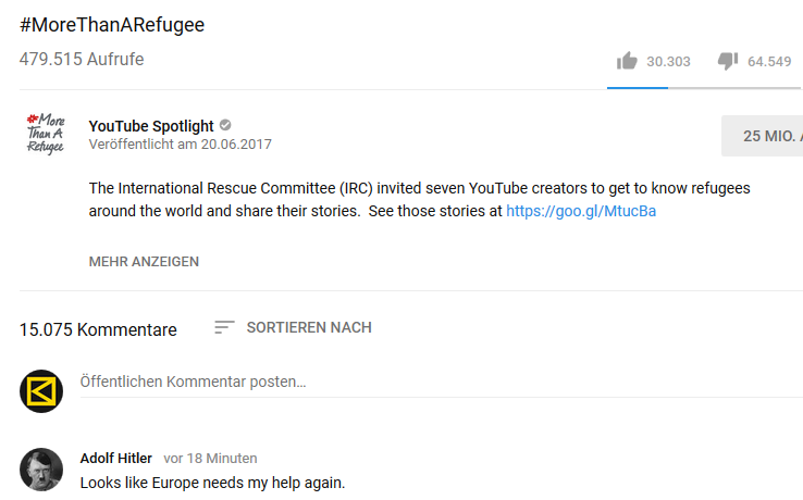naja, des war ja nicht der einzige in die Richtung ... aber er fiel mir halt direkt ins auge ... YouTube selbst war bzw ist da anscheinend noch fleißig solche aussagen und Nazi Flaggen am löschen ... klar die Bewertungen sind auch traurisch. Aber die Kommentare setzen da find ich noch eins drauf ... ich mien oke disliket das Video, ist ja schnell gemacht ... aber das der ganze Abschaum da noch meint sowas wie oben drunter zu schreiben, geht ja nochn schritt weiter ... like dislike ist ja noch easy, aber für Kommentare muss der faule User ja noch tippen ...