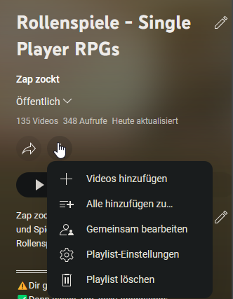 Eine eventuelle Möglichkeit, die das Ziel zumindest teilweise erreichen würde, wäre, die Playlist vom ursprünglich Account aus als "Gemeinsam bearbeiten" mit dem neuen Account zu teilen. Dann können beide Accounts Videos hinzufügen, aber nur der ursprüngliche Account könnte löschen, etc. Ich habe das noch nie gemacht, aber die Option ist vorhanden:Ich bin mir aber relativ sicher, dass der alte Account weiterhin der Inhaber bleibt und sollte man den Inhaber-Account löschen, wird mit hoher Wahrscheinlichkeit die Playlist verschwinden.