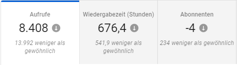 Ich finde gerade im Livestreaming Bereich merkt man diese "Downphase" noch mal ein ticken härter. Da ein Stream eben durch die Interaktionen mit der Community lebt und wenn man dort von 60-80 Zuschauern plötzlich bei 5-10 Zuschauern abdriftet dann macht das schon schwer zu schaffen und findet auch keinerlei antworten wieso.