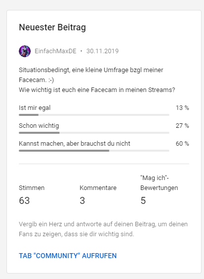 Dagegen hat YouTube eine sehr große Community, und ich werde schnell gesehen. Das alleine ist der Grund wieso ich YouTube vermutlich nicht verlassen werde um auf Twitch oder Mixer zu streamen. Ein weiterer Grund ist meine angesprochene jüngere Community, die jüngeren Zuschauer sind oftmals nur auf YouTube unterwegs gar registriert - Das sind potentielle Zuschauer / Abonnenten die es dann auf Twitch und Mixer nicht gibt.