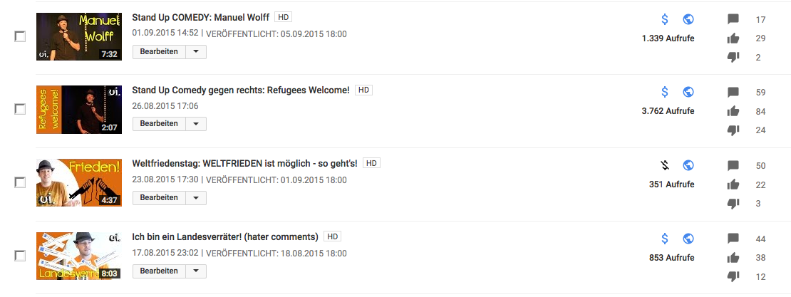 Also alle Videos markiert und Monetarisierung wieder angestellt. Hat auch geklappt, 817 Videos sind wieder monetarisiert, bei 27 ist es allerdings nicht möglich. Die Gründe sind mir allerdings unklar und stehen da auch nicht (nein, es ist keine Copyright-issue) ... was kann es sein, dass manche einfach ohne Grund nicht monetarisierbar sind? (Siehe "weltfriedenstag...")