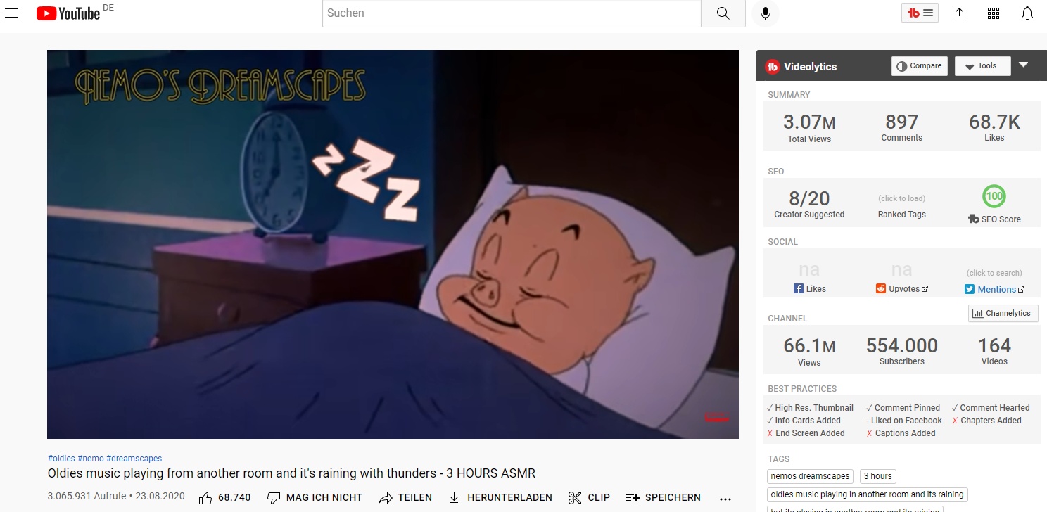 Titel des Videos:"Oldies music playing from another room and it's raining with thunders - 3 HOURS ASMR" - Die Beschreibung ist knapp gehalten, sieht für mich nach sehr stromlinienförmiger SEO aus, nichts Außergewöhnliches, beinhaltet die wichtigsten der videorelevanten Keywords.
