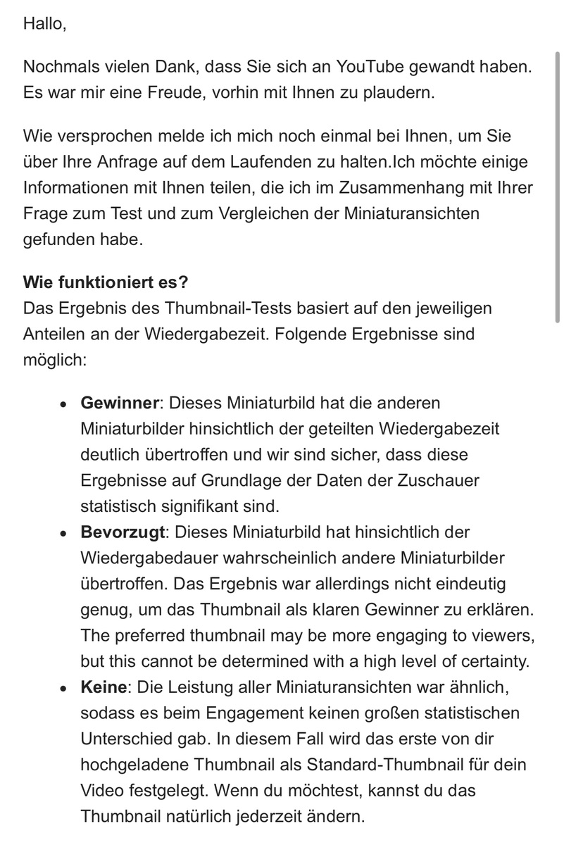 Zum Schluss sollte ich dann Feedback zum Thumbnailtest geben, dies beantwortet aber meine Frage nicht. Hoffe ihr könnt mir da mehr weiterhelfen.a la der Support von YouTube.