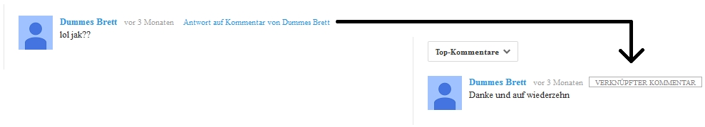 Welchen Kommentar? Meinst du das Bild unter dem Beitrag? Das ist nur ein Beispiel, wie so ein Verknüpfter Kommentar in Youtube aussieht.
