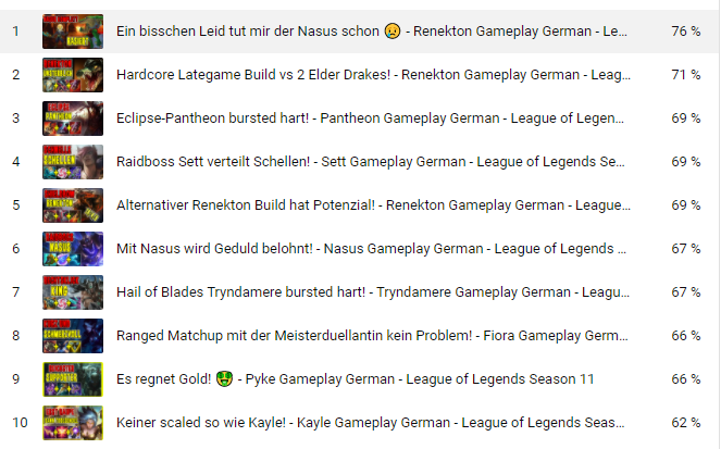 Ich bin in der League of Legends-"Branche" unterwegs und lade Gameplay-Videos (Mit "Educational-Fokus") und ab und zu Guides hoch. Ich bin jetzt seit 9 Monaten dabei und habe in der Zeit folgende Werte gesammelt.