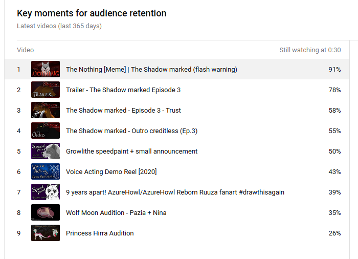 wollte man nachfragen, wie es bei euch mit der Zuschauerbindung nach den ersten 30 Sekunden aussieht. Ich würde gerne wissen, ob die Werte bei mir im Rahmen liegen (Man kann es ja nicht jedem Recht machen), oder ob ich da was tun muss.