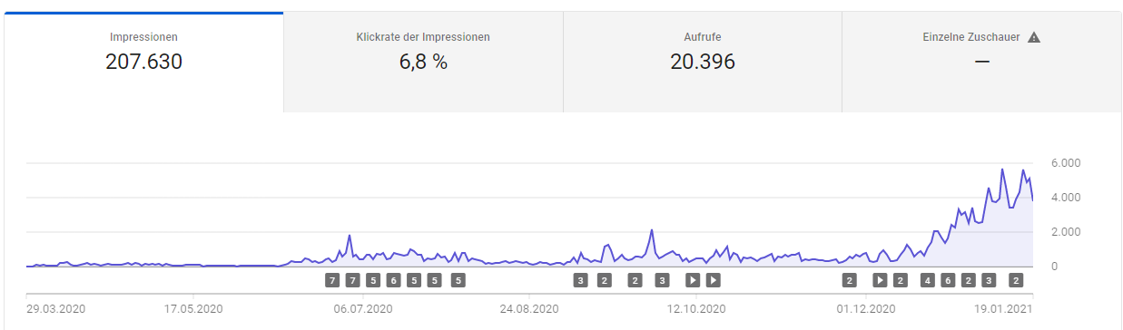 leg doch nicht so viel Wert auf die Impressionen. Die Watchtime ist entscheidend. Außerdem sollte man bei geringen Werten nicht so viel interpretieren. Da Verweise ich auf ZapZockt.