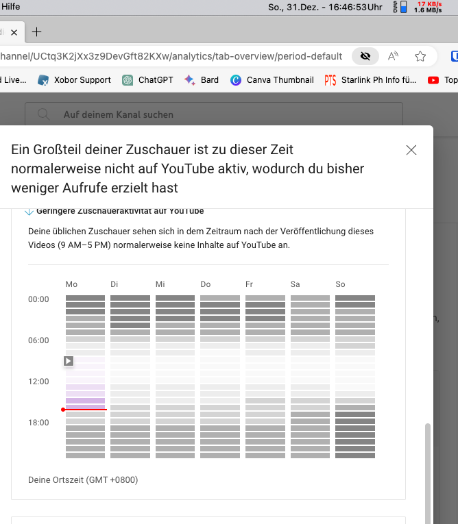 Die YouTube Statistik für meinen Deutschen Kanal ist völlig futuristisch, denn anstatt dass dort HEUTE Sonntag 31.12. 16:48 angezeigt wird ist bei meiner bereits MONTAG der 1. Januar - Mein Video habe ich also nicht HEUTE hochgeladen, sondern bereits erst MORGEN ....