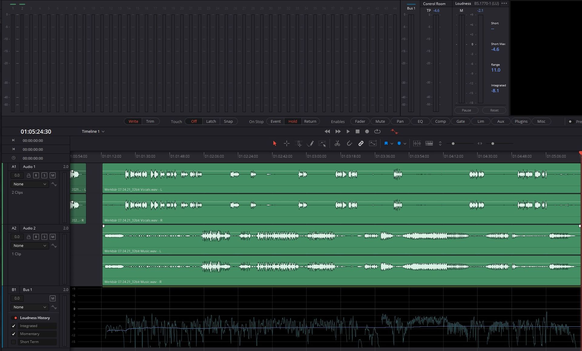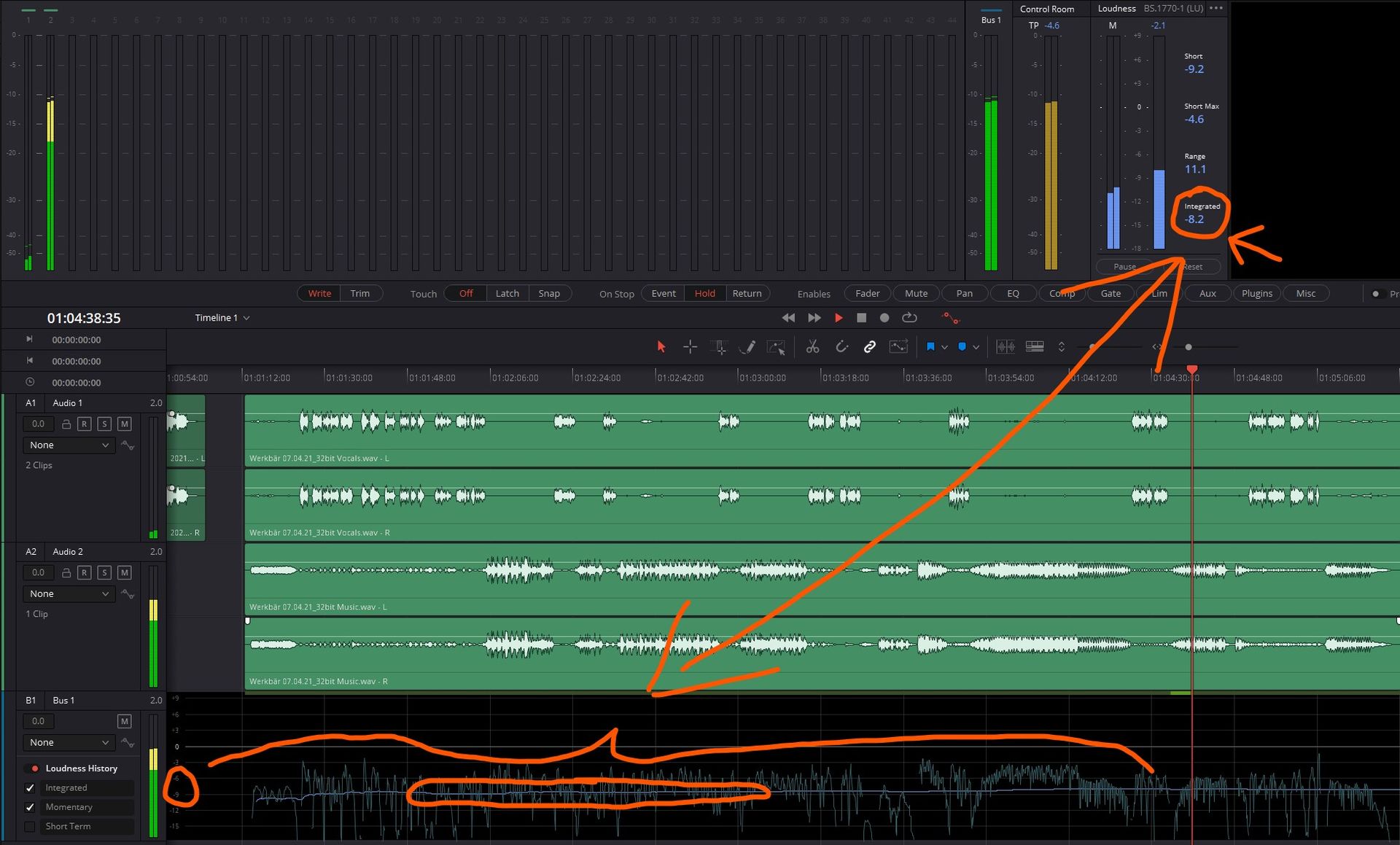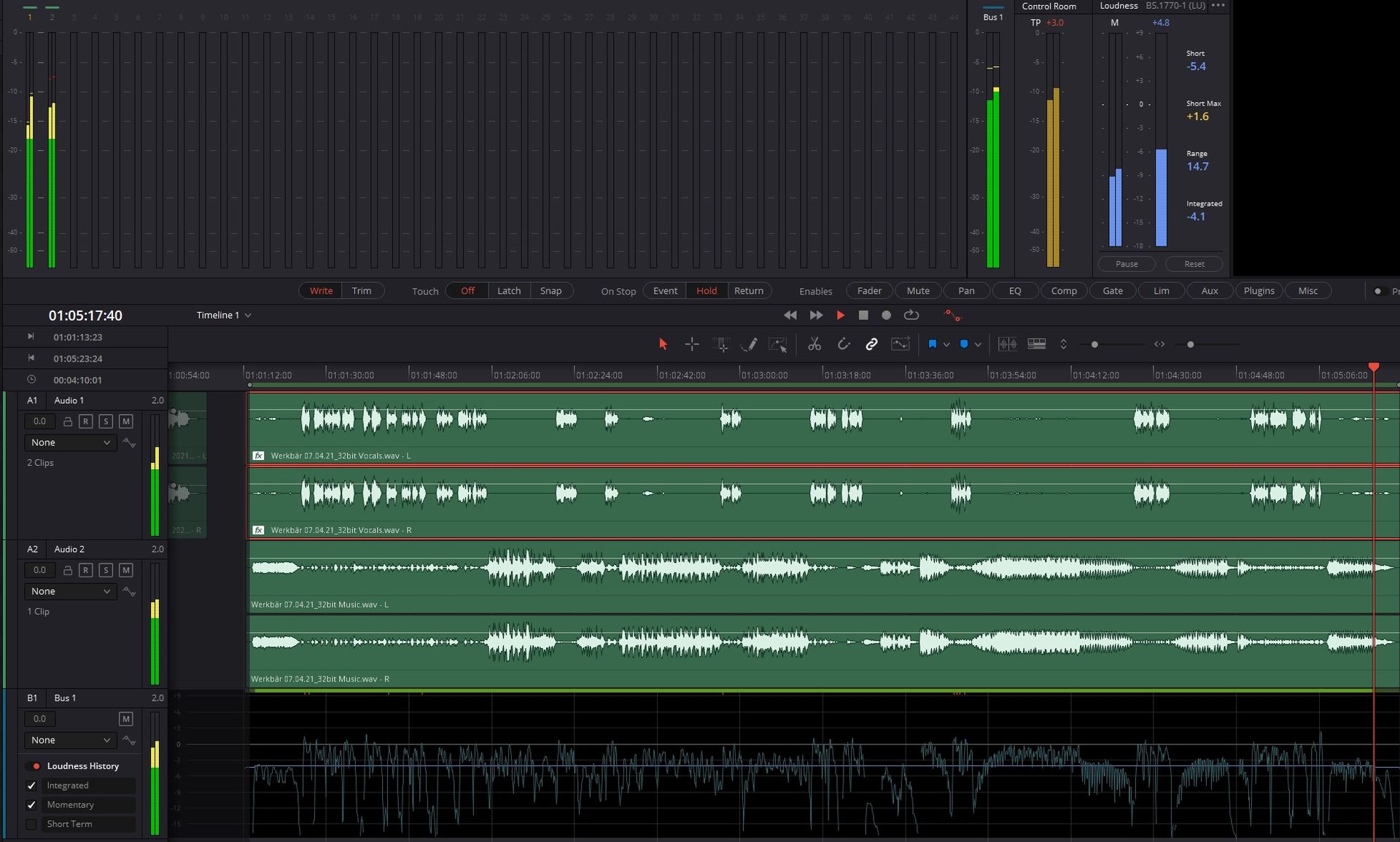 Jetzt fängst du an, die Musikspur anzupassen, dann die Sprache hinterher. Checkst wieder gegen, wo du bei den LUFS stehst. Nervig! Aber kein großes Thema bei zwei Audiopuren. Angenommen aber, dass du zig VoiceOver-Schnipsel hast und mehrere Music Tracks, ist das gar nicht lustig.