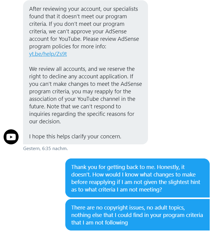 Kann mir hier bitte jemand weiterhelfen, was ich hier tun kann? Wurde hier tatsächlich mein YouTube-Kanal abgelehnt oder gab es einen technischen Fehler bei der Verknüpfung der beiden Konten? Ich bin hier sehr über die generischen Fehlermeldungen und Mails von Google und YouTube verwendet.