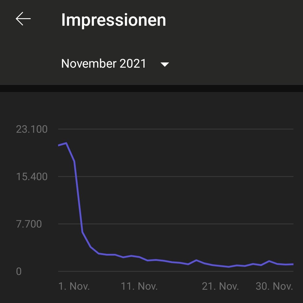 Genau das gleiche war bei mir vor einigen Monaten auch. Einige Zeit inaktiv, dann liefs auf einmal und als ich dann ein Video hochgeladen habe, sah meine Kurve (Aufrufe, Impressionen über den gesamten Kanal) genauso wie bei dir aus. Im Prinzip von 100 auf 0.