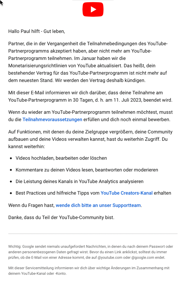 Mir war es nach einiger Zeit egal, da ich die Videos selber gehostet habe und darüber diese weiterhin abrufbar sind.
