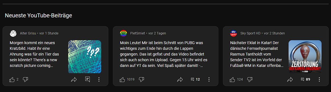 jetzt hat auch mein letzter Kanal den Community Tab erhalten, lustigerweise war das jener, der am meisten Aufrufe und am meisten Abos hatte. Naja er hat erst ca. 98.000 Aufrufe und 250 Abonnenten, aber trotzdem, der mit 1 Abo hat ihn viel früher erhalten