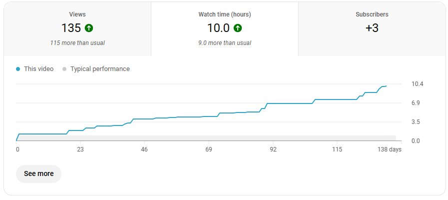 Grad bemerkt, als kleiner Meilenstein hat mein erfolgreichstes Video mittlerweile immerhin 10h Watchtime: