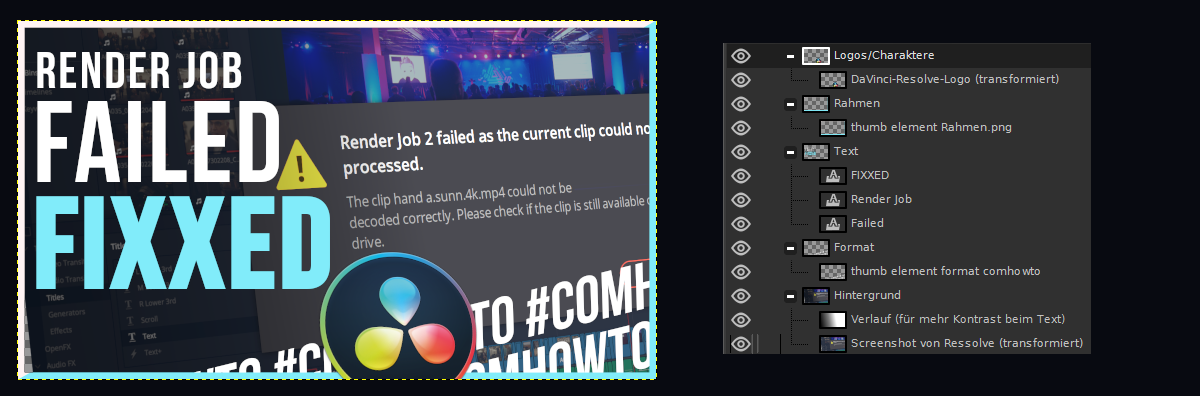 Hingegen bei z.B. Tutorials wie beim Render Fail Fix, gibt Text zum einen nochmal klarer das Signal, hier gibt es Hilfe, aber es gibt dem Searchcontent auch nochmal Gewichtung, denn auch Texte im Video, Thumbnails geben den Suchmaschinen Futter.