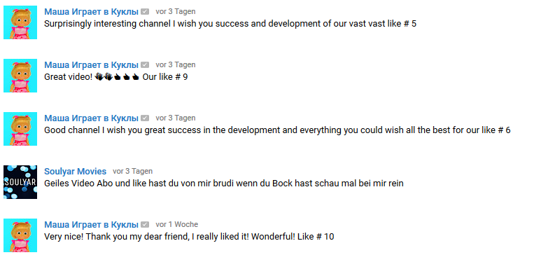 Desweiteren ist die Sub4Sub Faktion aktl wieder sehr stark Vertreten, die dich den einen Tag abonieren mit einem Hinweis der automatisch als Spam erkannt wird und am nächsten Tag einen deabonieren.
