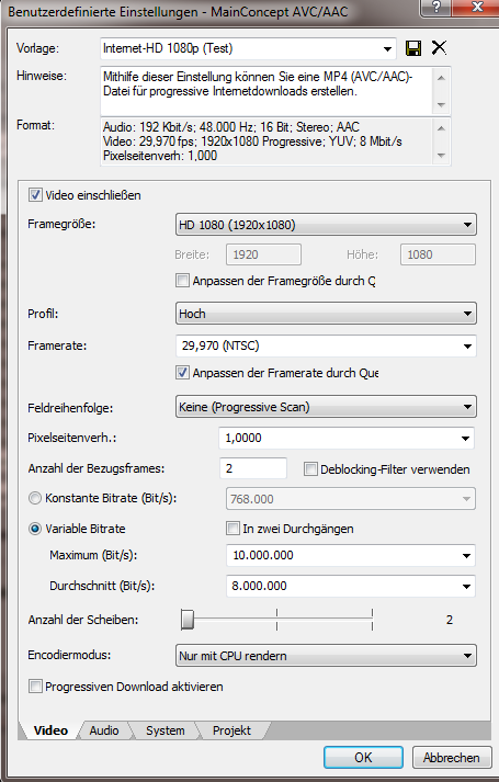 Bitte Verbesserunsgvorschläge, ob MainConcept AVC/AAC(*.mp4/*.avc) die richtige Wahl ist, um die maximale Kompression herauszuquetschen.