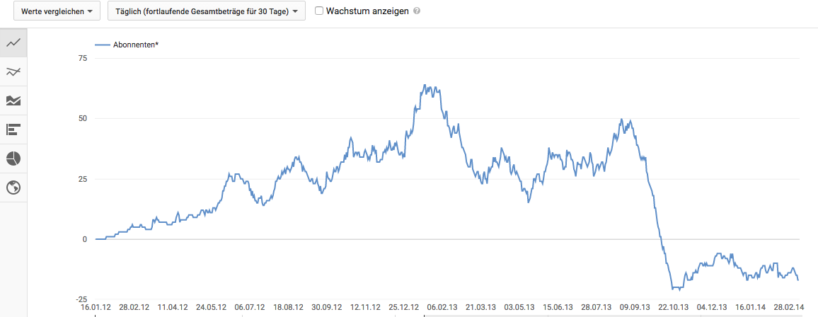 Viel schlimmer war aber, dass meine Abonnenten auch gingen weil es ein toter Kanal war..hier mal die Abo Statistik von Youtube