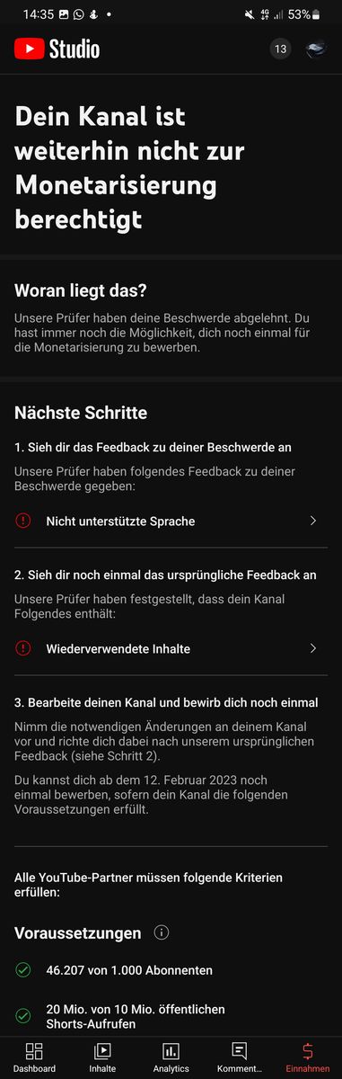 Ich habe ein kleines Problem mit meiner youtube Monetarisierung.