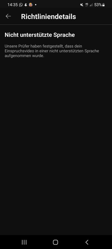 Woraufhin ich ein Einspruchsvideo erstellt habe. Dieses wurde wiederum abgelehnt weil ich angeblich eine nicht unterstützte Sprache spreche. Ist deutsch keine unterstützte Sprache? 😅
