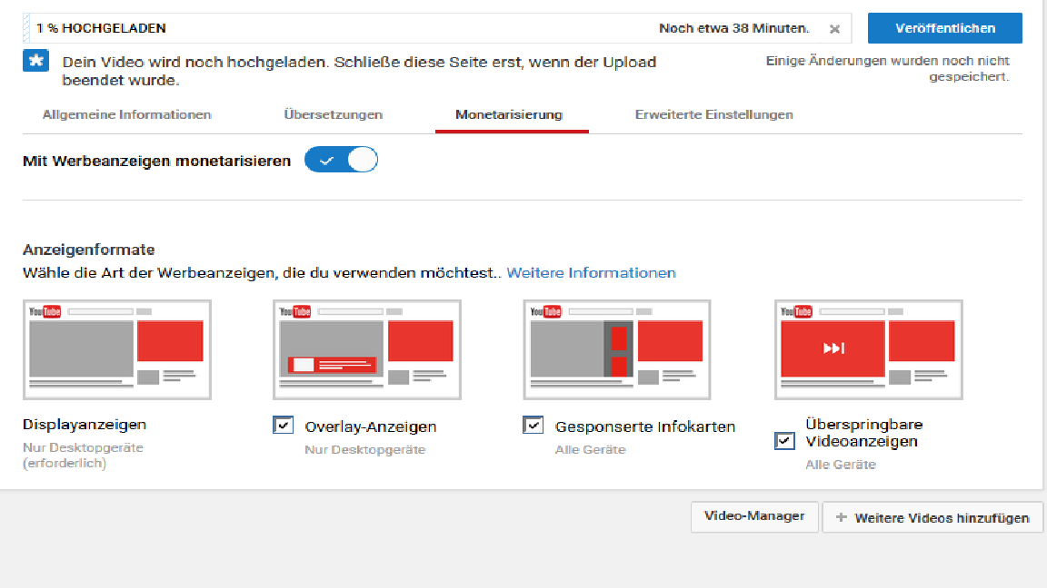 Bei Videos die über 10 Minuten lang sind, bekommst du mehr Auswahl- und Einstellmöglichkeiten für die Werbung, und kannst Clips zu bestimmten Zeiten einfügen. YouTube entscheidet dann aber selbst, ob und welche Art von Werbung geschalten wird.
