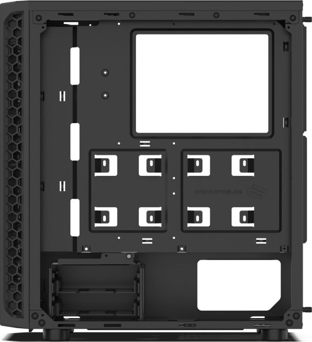 Freunde von Großen Hartglass oder Acryll Fenstern sowie blinkenden RGB Lichtern sollten einen Bogen um dieses Gehäuse machen, das hat es schlicht und einfach nicht. Highlight des Designs ist das Wabenförmige Mesh das die gesamte Front bedekt sowie ebenfalls Wabenförmige Lüftereinlässe neben dem Mesh. An der Oberen Kante gibt es ein Magnetischen Staubfilter. Das Innere des Gehäuses ist aufgeräumt, das Netzteil ist abgedeckt und hat im Tunnel noch Platz für zwei HDDs. Hinter dem Mainboard passen noch zwei SSDs hinein. Wer also vorhat mehr als 2 HDDs und SSDs in sein Gehäuse zu bauen, sollte sich ein anderes Gehäuse suchen. Auch ist es anzumerken das es keinen Platz für Interne DVD Laufwerke gibt. Zusammenfassend kann man also sagen "Schlicht aber nicht Langweilig".--- Luftzug ---