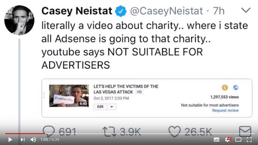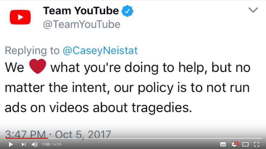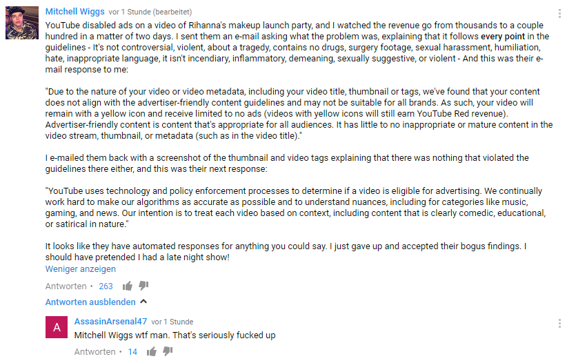 Ich will aber auch nicht abstreiten, dass YouTube Probleme hat, an denen sie arbeiten müssen. Werbepartner sollten mehr Optionen kriegen, um Werbung gezielter auf Inhalte zu schalten, die Werbefreundlichkeitseinstufung muss besser und differenzierter werden und Kontexte erkennen (schwierig), YouTube sollte bzql der Regeln transparenter gegenüber den YouTuber sein etc.