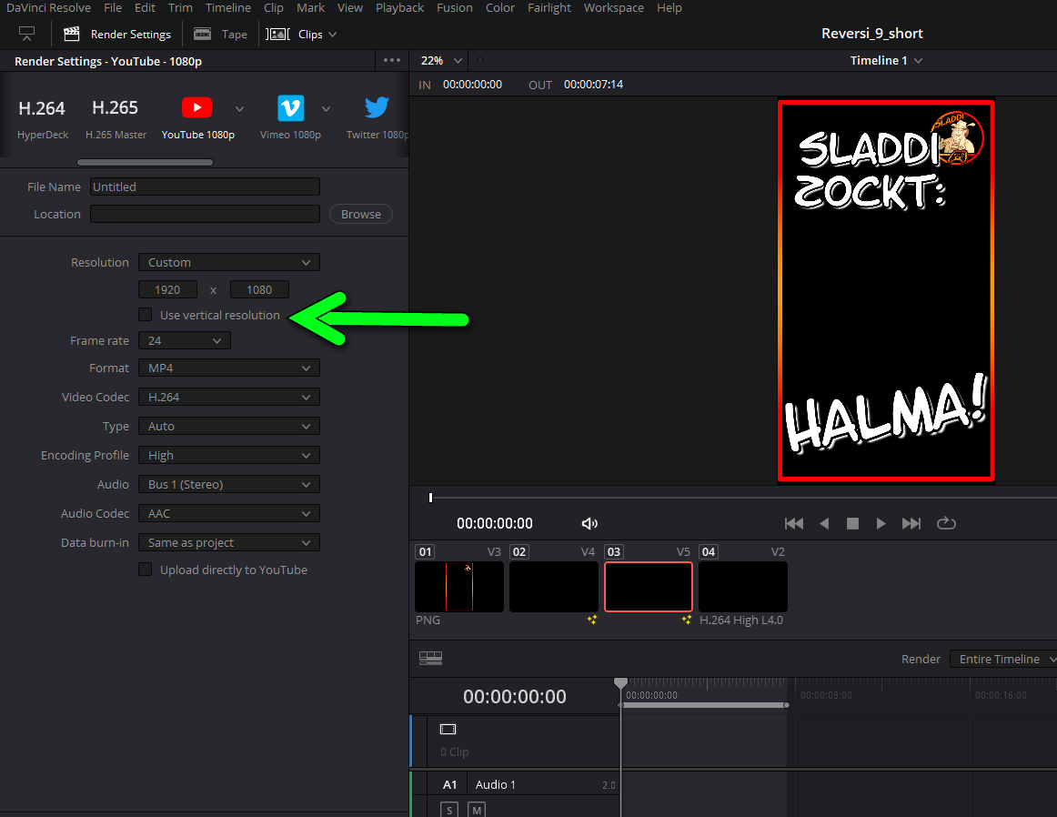 Dazu gehst du zur "Deliver-Page" und änderst dort nochmals die Auflösung deines Shorts