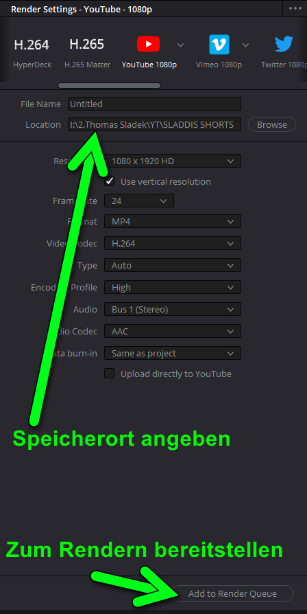 Nun solltest du noch einen Speicherort für dein Short benennen, und wie gewohnt das Video zum rendern bereitstellen.
